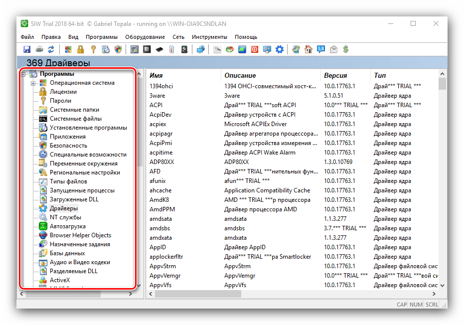 - В меню слева можно также узнать программные особенности машины – например, сведения об операционной системе и состоянии её критически важных файлов, установленные драйвера, кодеки, и прочее.
