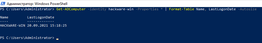 Get-ADComputer -identity hackware-win -Properties * | Format-Table Name,LastLogonDate -Autosize
