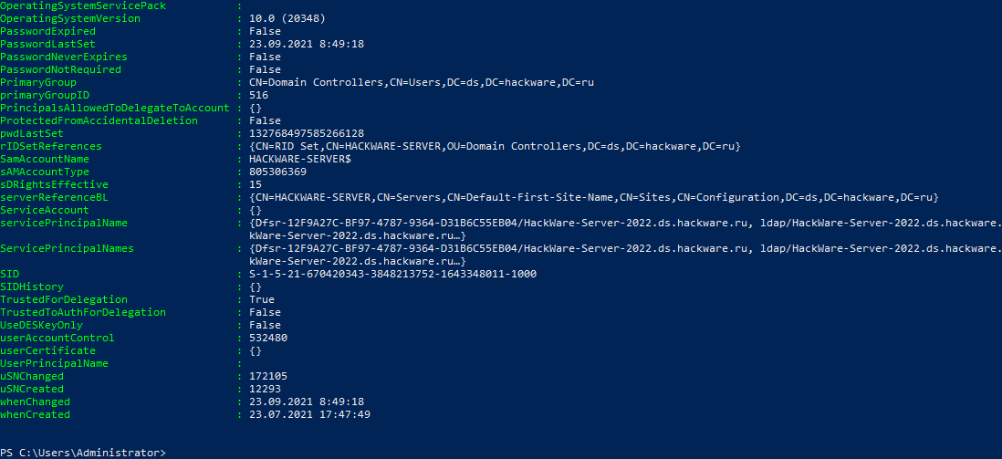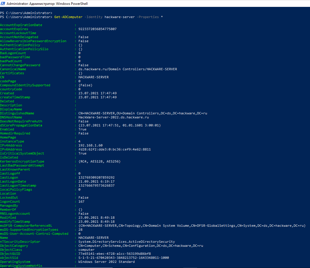 DistinguishedName : CN=HACKWARE-SERVER,OU=Domain Controllers,DC=ds,DC=hackware,DC=ru DNSHostName : HackWare-Server-2022.ds.hackware.ru Enabled : True Name : HACKWARE-SERVER ObjectClass : computer ObjectGUID : 77e65141-ebec-4728-a1cc-563199d86bf8 SamAccountName : HACKWARE-SERVER$ SID : S-1-5-21-670420343-3848213752-1643348011-1000