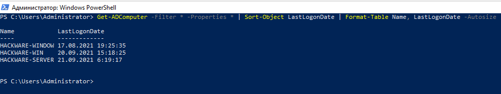 Командлет Get-ADComputer позволяет отображать любые свойства компьютера в результатах выполнения команды. Удалите всю ненужную информацию, оставив только значения атрибутов Name и LastLogonDate.