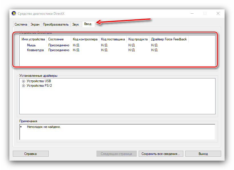 - Название вкладки «Ввод» говорит само за себя – здесь располагаются данные о клавиатуре и мыши, подключённых к компьютеру.