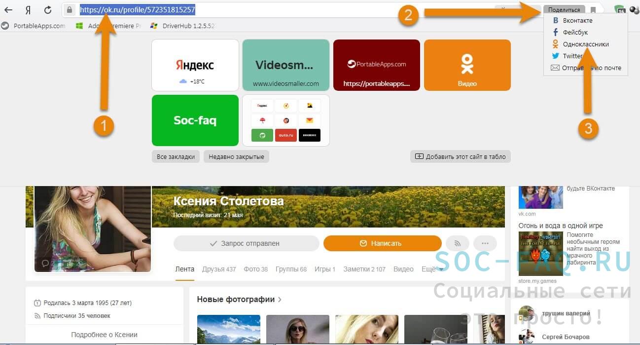- Как это сделали, откроется окошко «Поделиться». Из предложенного списка выбираем необходимую социальную сеть и жмем по ней.