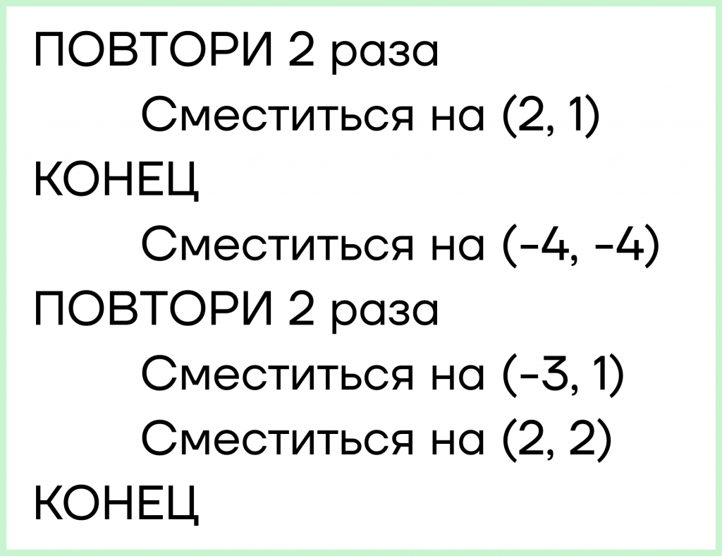 - Запись Повтори k , означает, что последовательность команд в скобках повторится k раз.