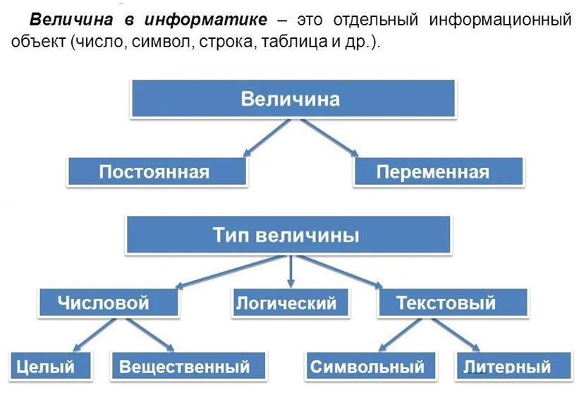 Чтобы описать процесс выполнения той или иной операции алгоритмически, нам понадобятся величины/объекты – то, чем будем оперировать, над чем выполнять какие-то действия.