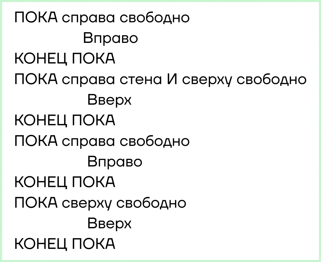 С таким алгоритмом команда «вправо» будет выполнена только в том случае, если справа свободно, иначе не произойдет ничего.
