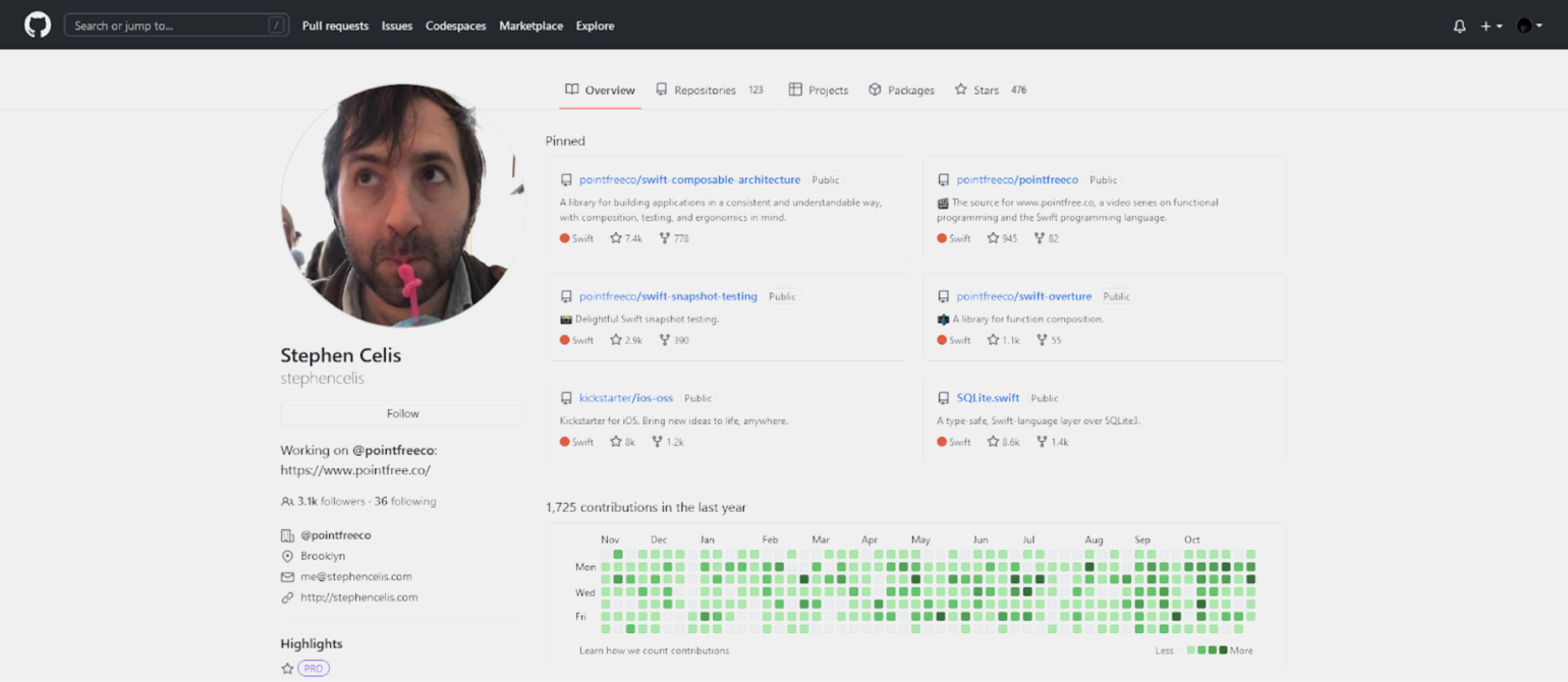 На первом месте — некий Стивен Селис. А что в его профиле? Указано место работы, есть сайты и контакты, а в статистике — 123 репозитория и 1725 изменений в репозиториях за год (круглый год). То есть невооружённым глазом видно, что человек как минимум активный и опытный.