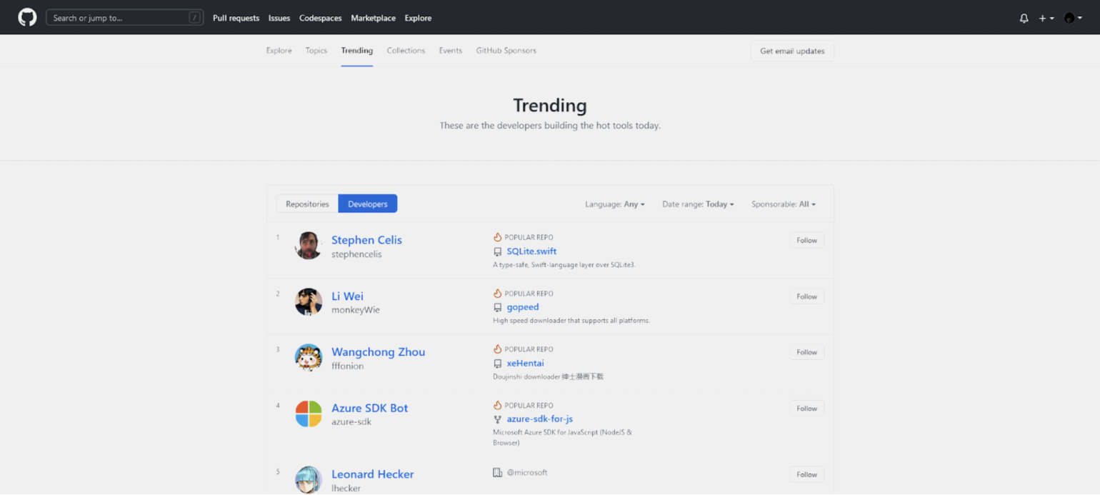 Посмотрим на профиль какого-нибудь крутого разработчика из тех, кто сейчас в тренде GitHub (да-да, есть и такой раздел).