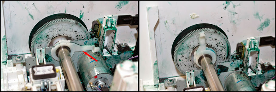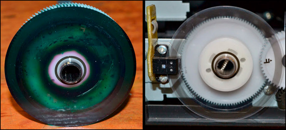 Последнее, что осталось сделать, это почистить позиционирующий диск. Возьмите ту часть, которую отложили ранее (в пункте №8). Тщательно протрите вал, шестеренки и прочие детали узла. Сам энкодерный диск промывайте исключительно водой. Если для его чистки Вы используете спирт или любую иную агрессивную жидкость, то можете испортить деталь, стерев специальные насечки на ней. Также нужно будет протереть энкодер принтера сухой салфеткой. Не старайтесь полностью оттереть позиционирующий диск от чернила. Нет ничего страшного том, что он окрасился в цвет красителя. Ведь основную свою функцию он будет выполнять даже в таком состоянии.