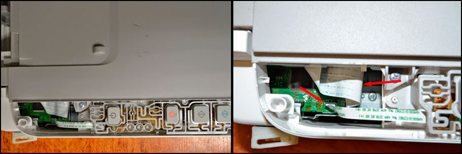 4. Отщелкиваем накладку с панели управления, отключаем два шлейфа (широкий и узкий) и снимаем верхнюю часть принтера (сканер).
