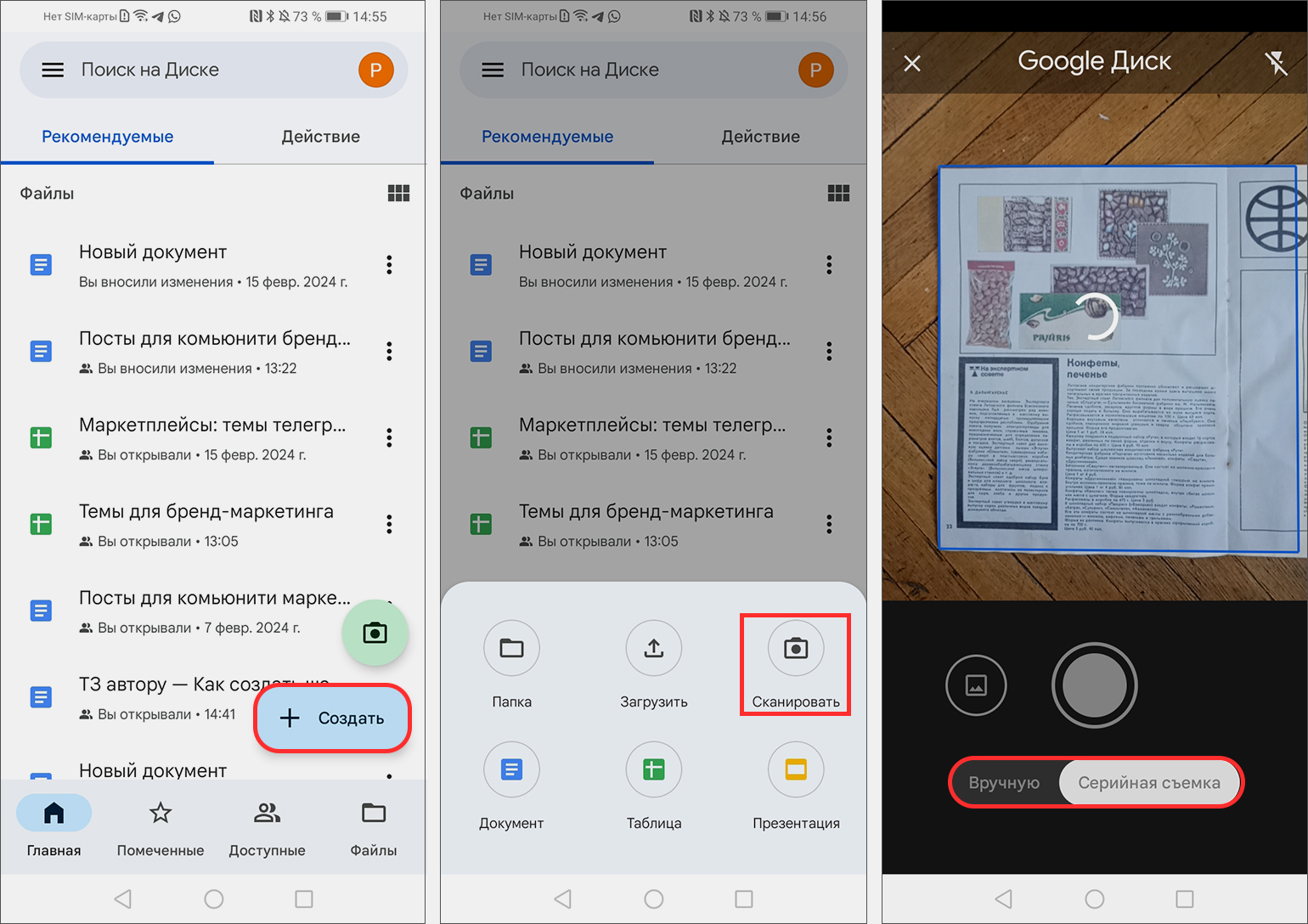 Откроется камера. Под кнопкой съёмки расположен переключатель режимов съёмки. В режиме «Вручную» вам нужно будет самостоятельно нажимать на кнопку съёмки, чтобы сделать снимок. В режиме «Серийная съёмка» камера сама распознаёт документ и автоматически делает снимок.