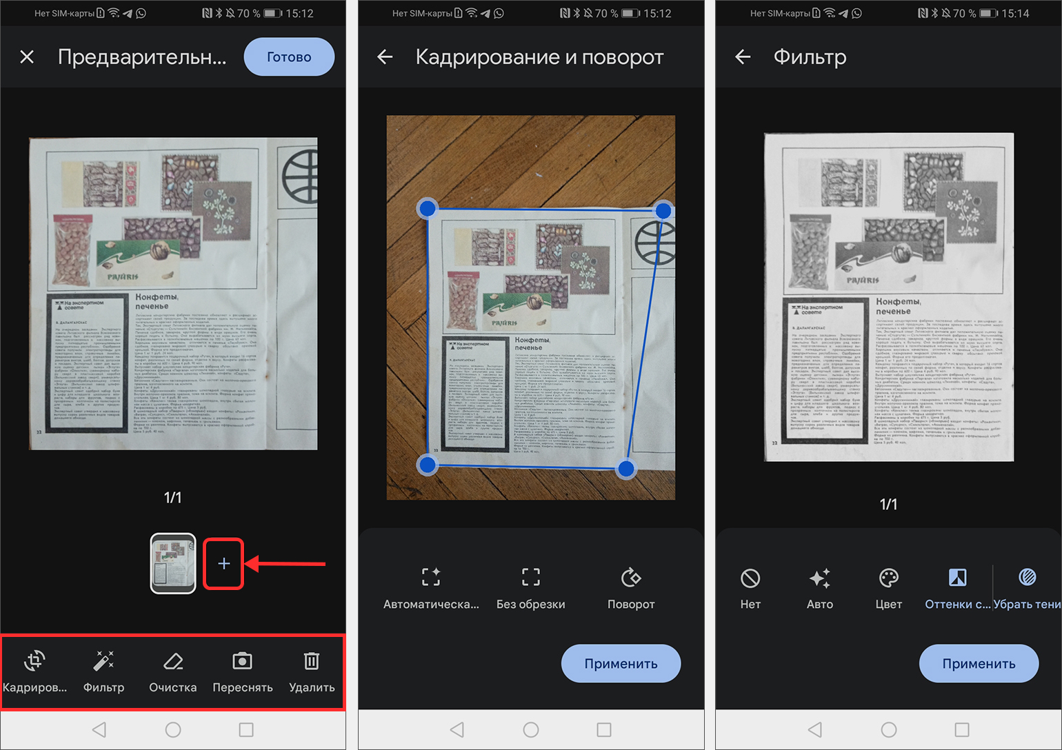 - фильтр — можно сделать результат сканирования чёрно-белым, а ещё убрать тени, например, если лист был мятым;