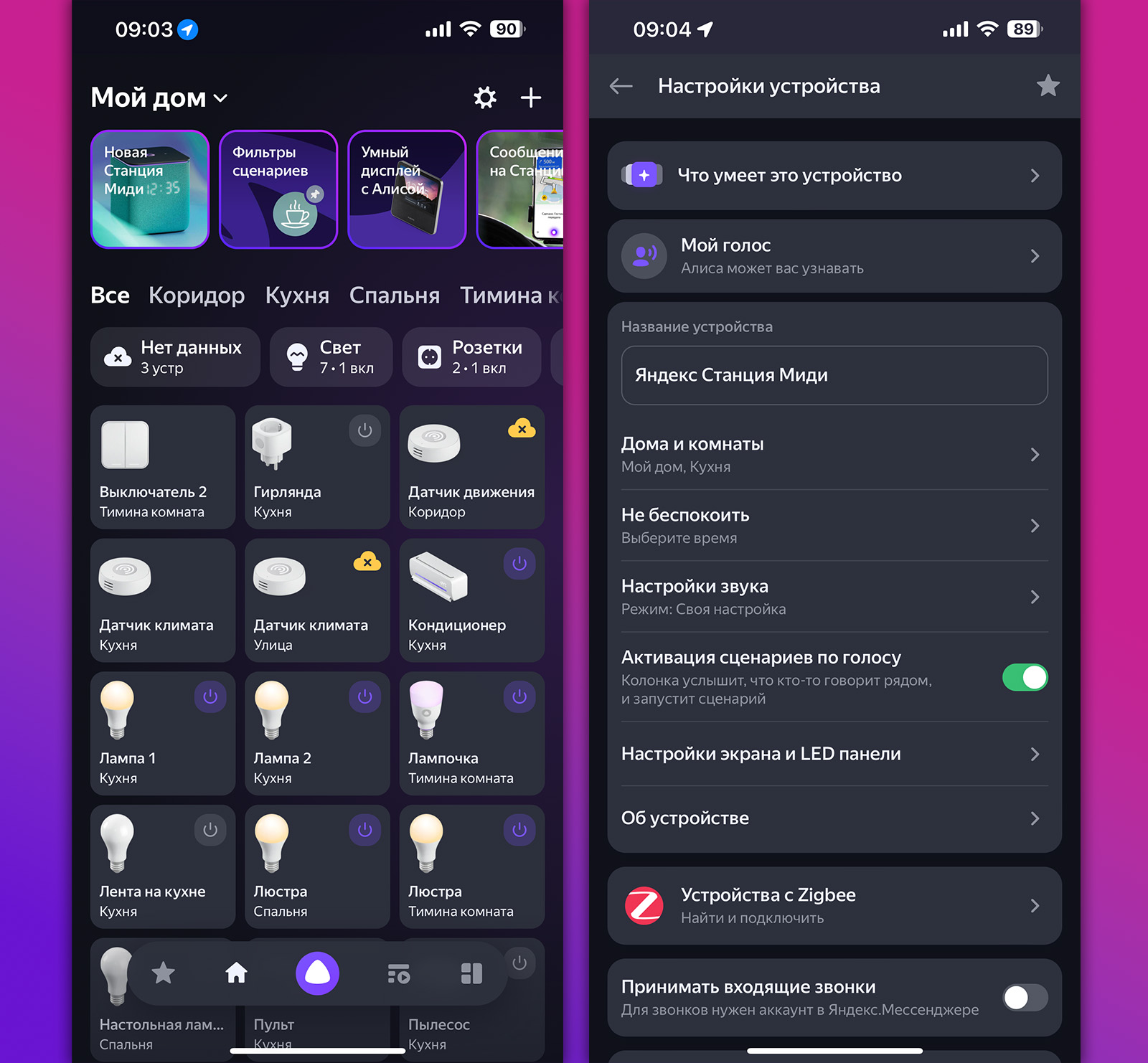 Это очень крутой триггер, который поднимет «умность» и автоматизированность дома на новый уровень, если его правильно настроить. Включить функцию можно в два тапа по настройкам колонки в приложении Умный дом с Алисой.