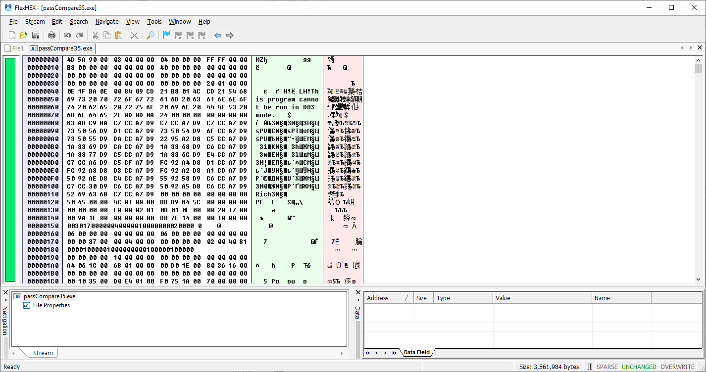 Ладно, «пойдем другим путем». Строго говоря, FlexHex не понимает формат РЕ и потому его нельзя признать полноценным PE-редактором. Поэтому нам ничего не остается, как исправить байтики. Из того же отладчика, где мы нашли проверяющую пароли инструкцию, возьмем уникальную последовательность байт: