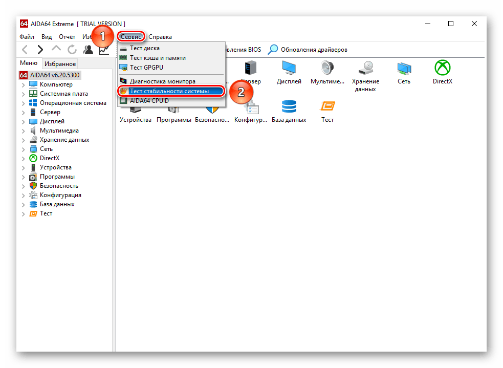 - Щелкните по пункту строки меню «Сервис» и выберите «Тест стабильности системы».