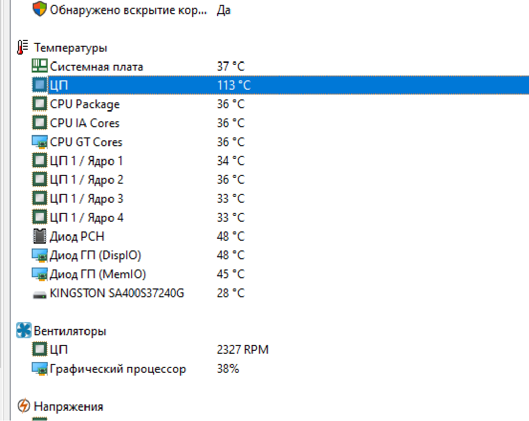 - Долистайте до температуры CPU и ядер на отчётный момент и просмотрите данные.