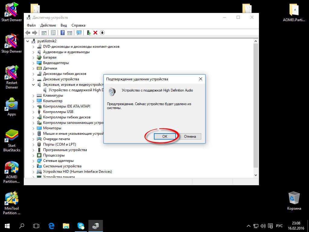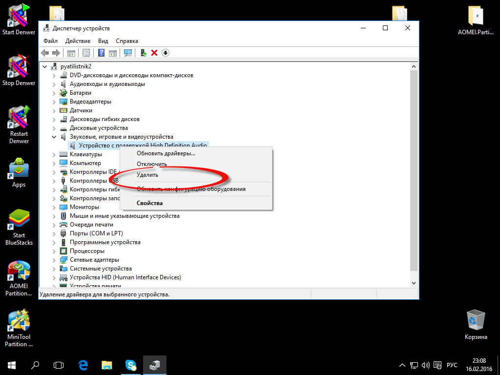 - Предварительно удалить звуковую плату (из раздела Звуковые, игровые и видео устройства) и все устройства из раздела аудиовходы и аудиовыходы через диспетчер устройств (правый клик по устройству — удалить),