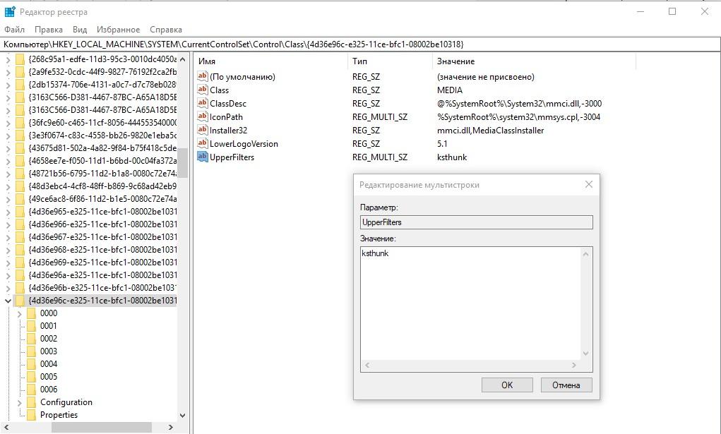 Открываю параметр UpperFilters и, если кроме значения ksthunk присутствуют еще какие-то, удаляю их.