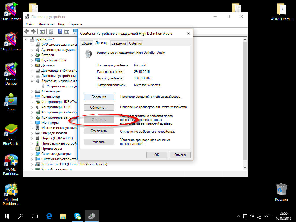 Далее вкладка Драйвер > Откатить. Такое простое количество действий поможет восстановить звук в Windows 10.