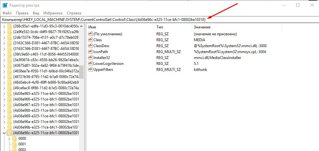 Следую по указанному пути –HKEY_LOCAL_MACHINE\SYSTEM\CurrentControlSet\Control\Class\{4d36e96c-e325-11ce-bfc1-08002be10318}. Перехожу в раздел.