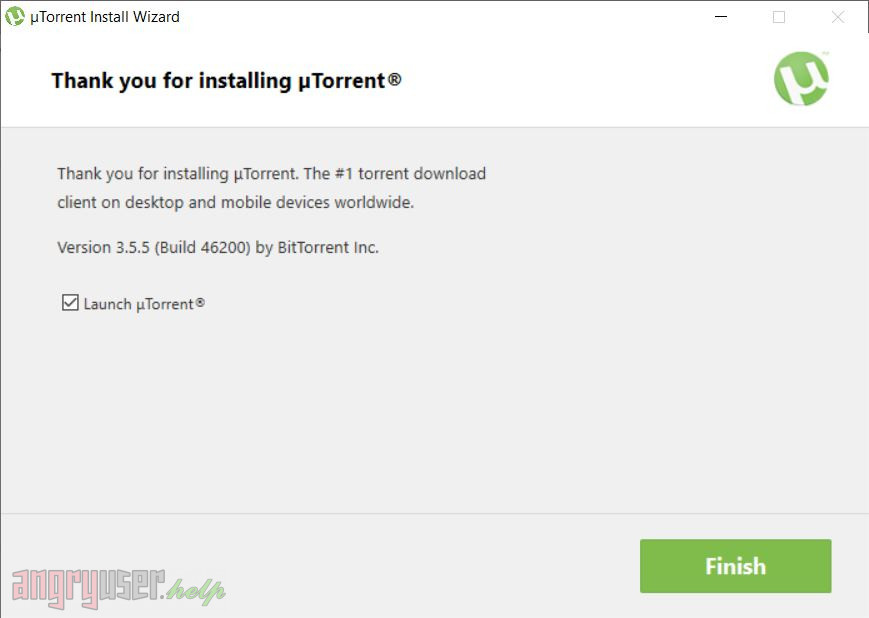 Дождитесь окончания установки и появления последнего окна инсталлятора. В нем вы можете, если хотите, отключить запуск uTorrent после выхода из инсталлятора (снимите галочку возле пункта «Launch µTorrent»). Далее нажмите кнопку «Finish».