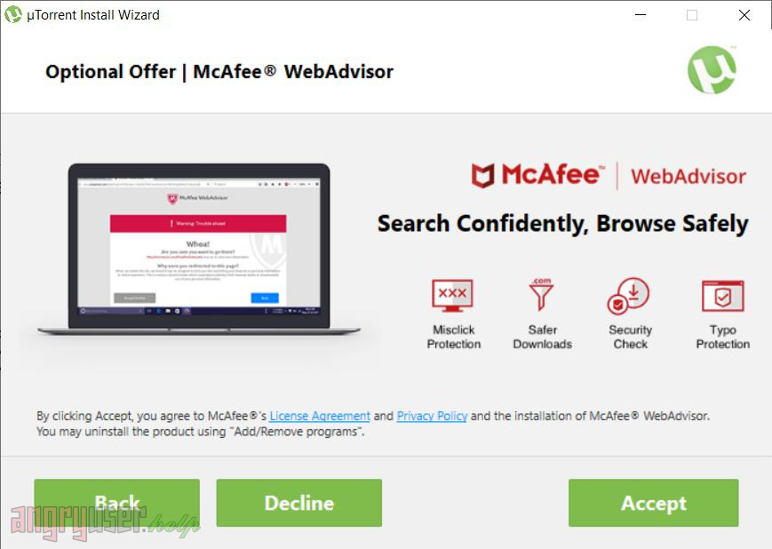 Началось! В открывшемся окне нас ждет первая партнерка. Вам предлагают установить какой-то софт от McAfee. Не думаем, что он вам нужен. Нажимает кнопку «Decline» (Отклонить).
