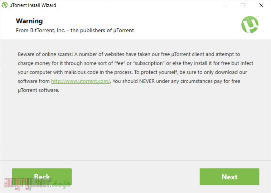 Нажмите кнопку «Next» (Далее). Откроется второе окно, в котором нас предупреждают о том, что некоторые сайты могут распространять «ненастоящий» uTorrent.