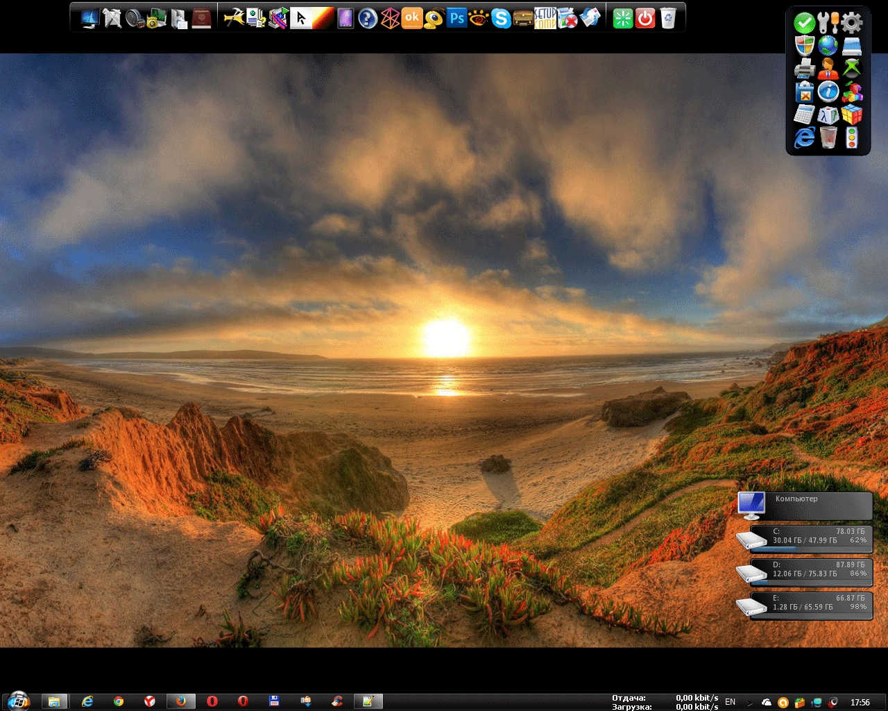 На Рабочем столе можно размещать довольно много, но лучше этого не делать, а то потом будет беспорядок, в котором будет только сложнее что-то найти. Размещайте здесь ярлыки только тех программ, которыми наиболее часто пользуетесь. Можете посмотреть на мой рабочий стол.