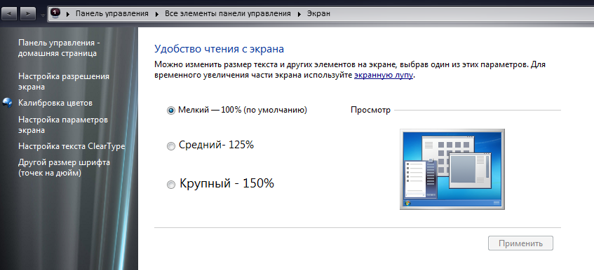 В верхней части окна «Разрешение экрана» переключиться на окно «Экран». Здесь можно установить более крупный размер текста и других объектов экрана, что особенно удобно для людей с пониженным зрением.