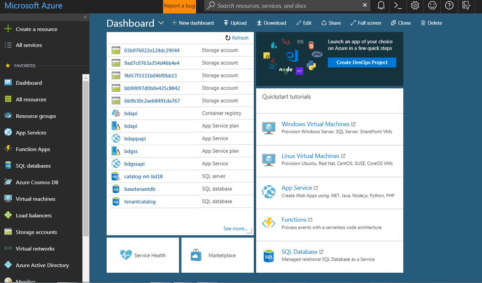 Что касается моей тестовой поездки, попав на портал, я нажал «Все ресурсы» в левой части экрана, чтобы перейти к тестовой учетной записи, которую мне предоставил Microsoft. В списке ресурсов я щелкнул «SiteEE», одну из баз данных SQL Azure. На следующем экране представлен список руководств по быстрому запуску, которые стоит потратить ваше время на изучение. Тем не менее, система интуитивно понятна, и многие пользователи легко смогут найти свой путь самостоятельно. Вы также можете быстро запустить приложение, нажав кнопку «Создать проект DevOps» на этом экране.
