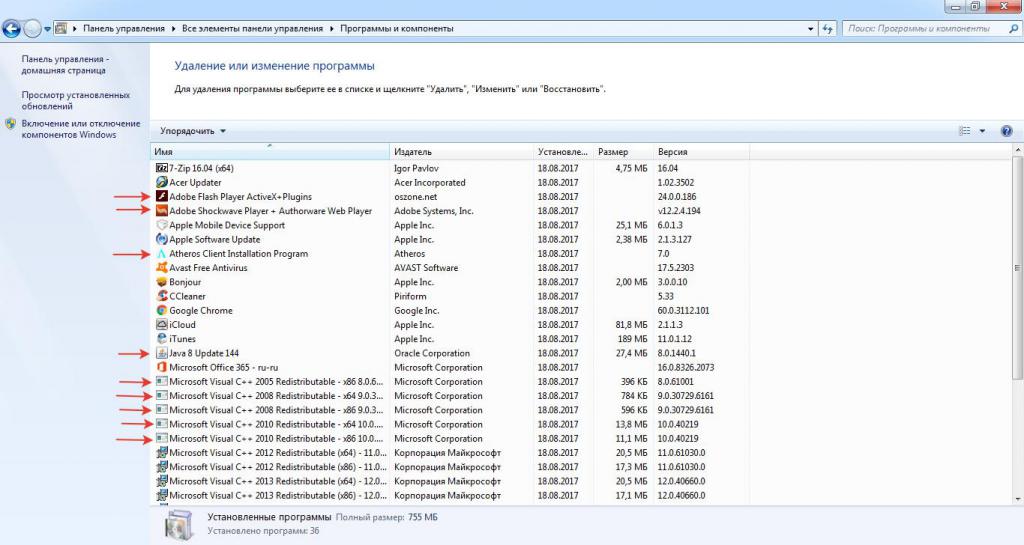 Для начала зайдите в раздел программ и компонентов и посмотрите, что есть в списке. Не спешите удалять ненужные приложения, поскольку встроенные деинсталляторы самой операционной системы или установленных программ после выполнения стандартной процедуры могут оставлять кучу мусора. Это и ключи реестра, и файлы, и каталоги. Все это придется чистить вручную.