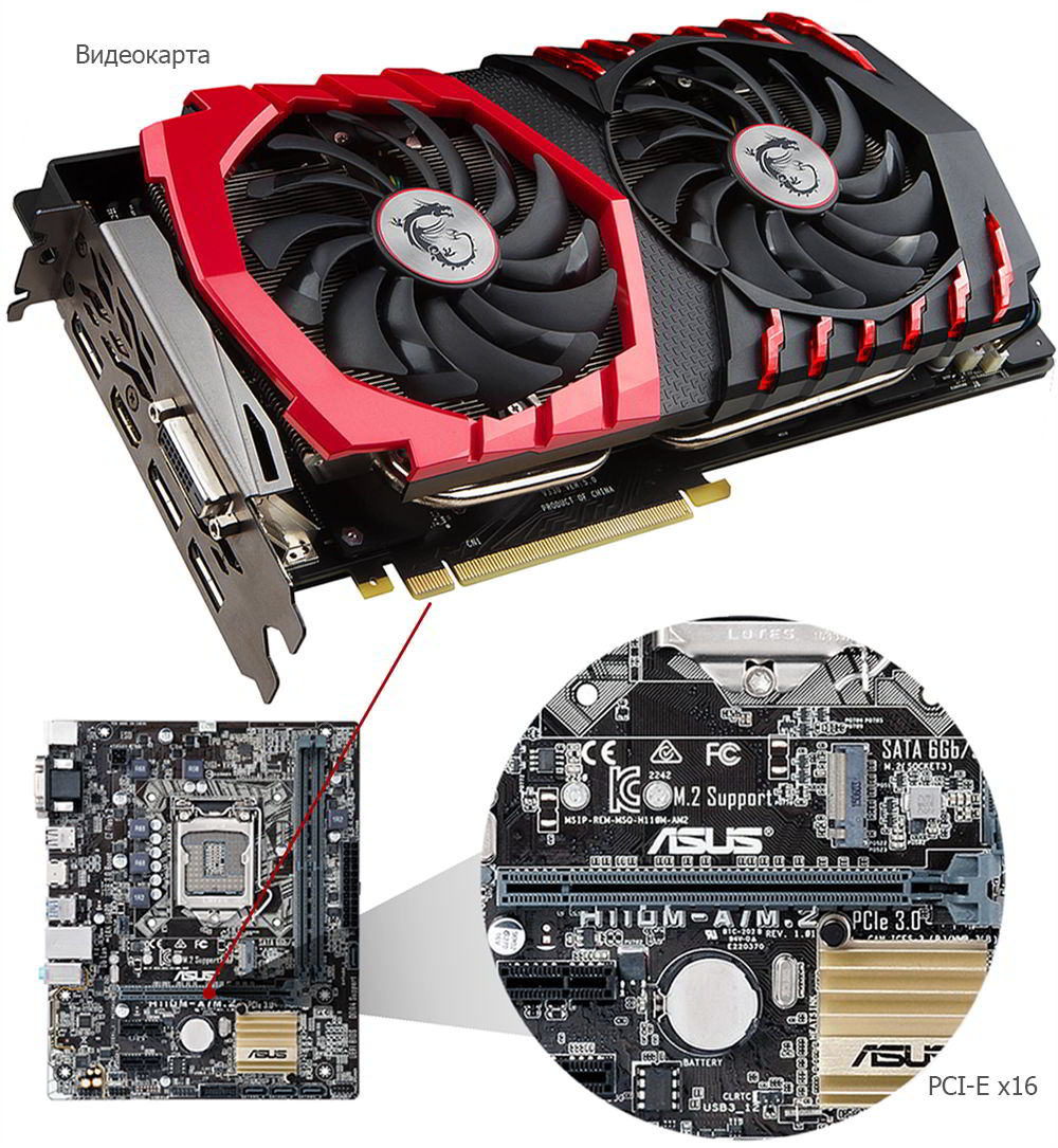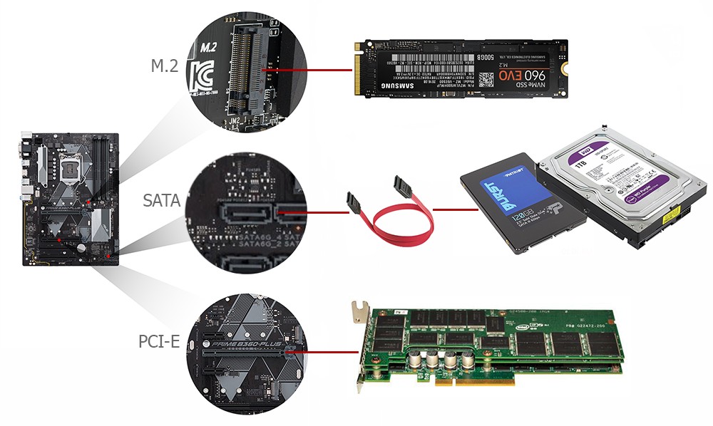 К материнской плате SSD и HDD обычно подключаются через интерфейс (разъем) SATA. Существуют более быстрые варианты SSD, предназначенные для подключения к разъемам M.2 или PCI-E материнской платы (см. рис.)