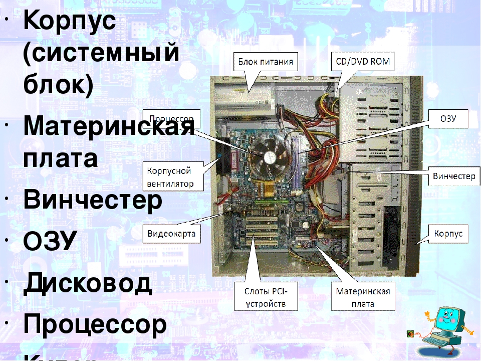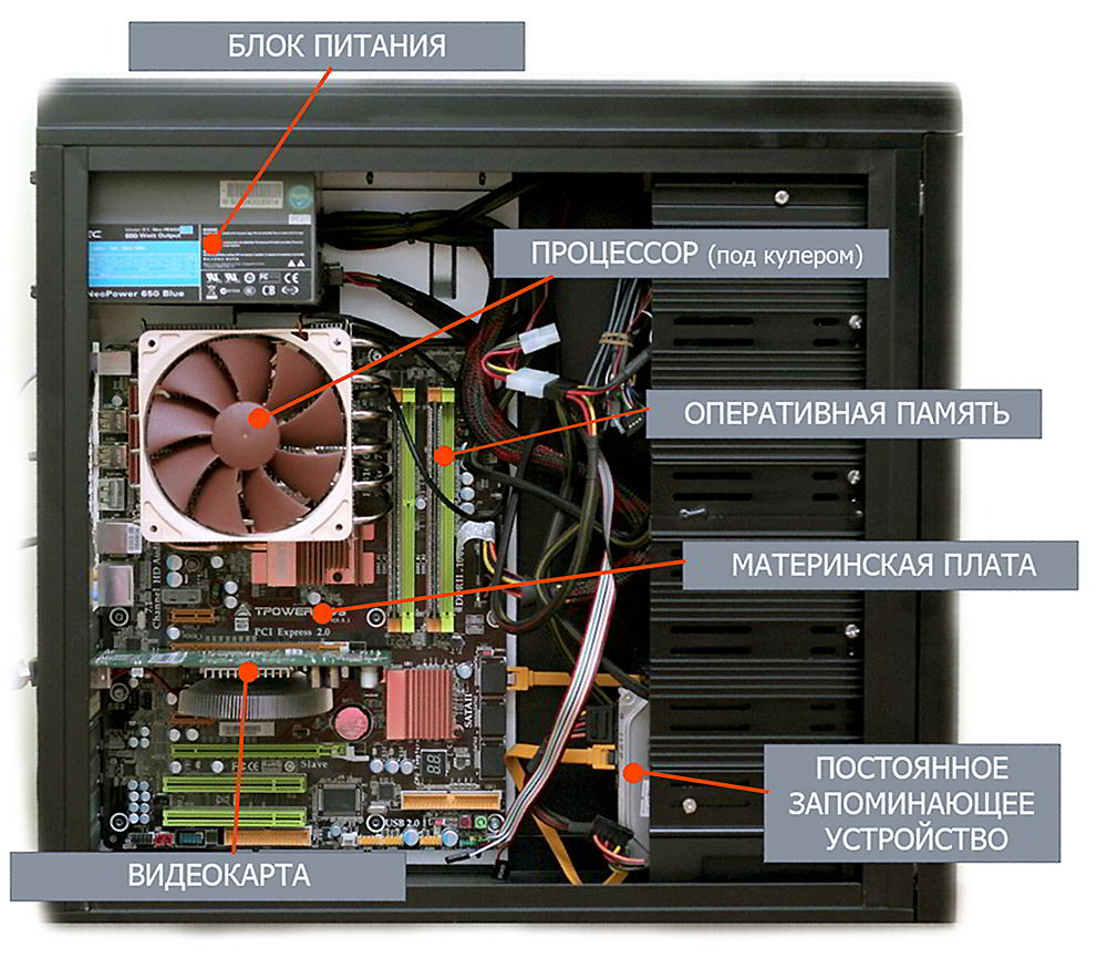 Системный блок состоит из нескольких ключевых частей, без которых компьютер не может функционировать — это материнская плата, процессор, оперативная память, постоянное запоминающее устройство и блок питания. Критически важным является также наличие видеокарты, без которой невозможен вывод из компьютера графической информации.