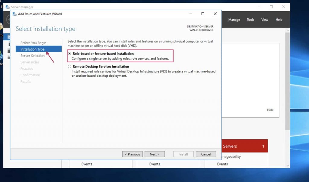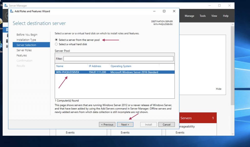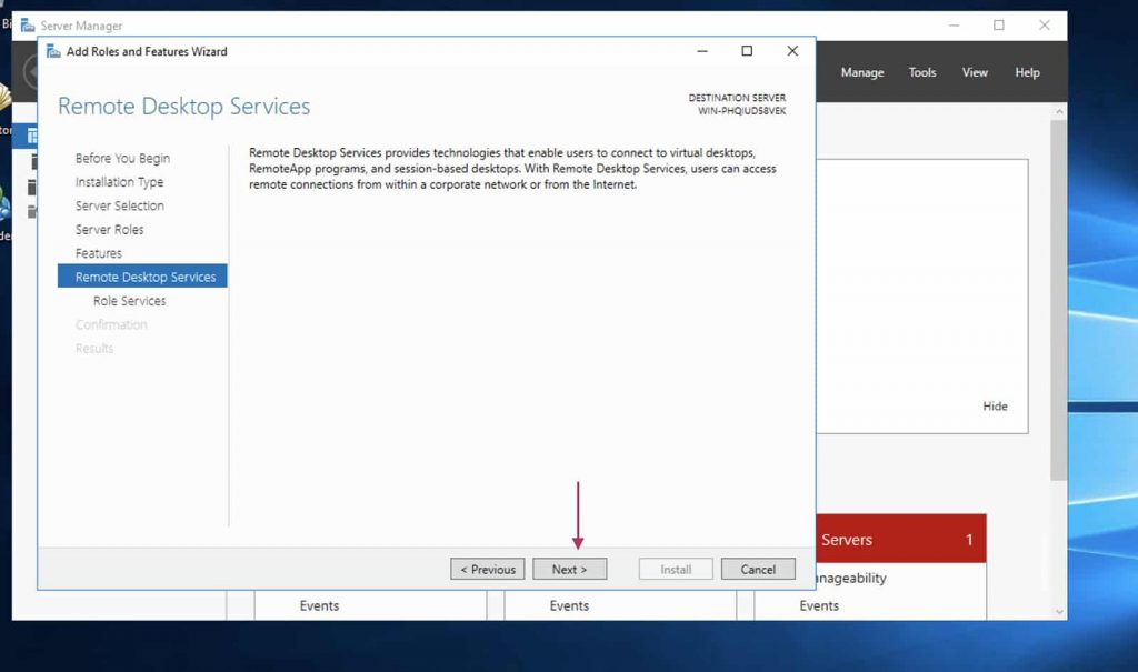 Выберите Роли сервера (Server Selection) затем поставьте галочку Remote Desktop Services и нажмите Далее (Next)