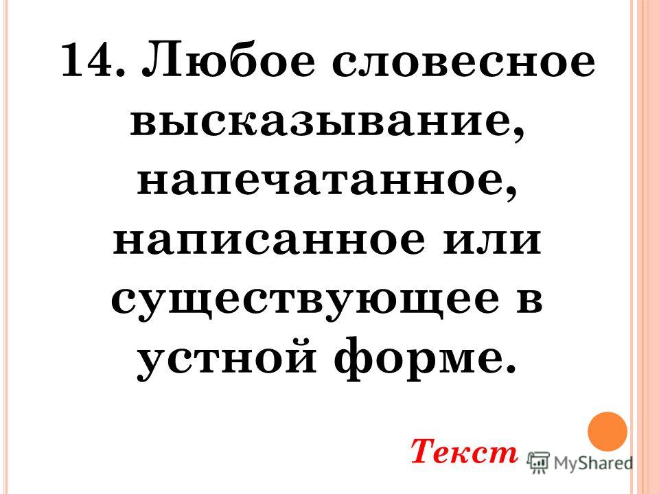 14. Любое словесное высказывание, напечатанное, написанное или существующее в устной форме. Текст