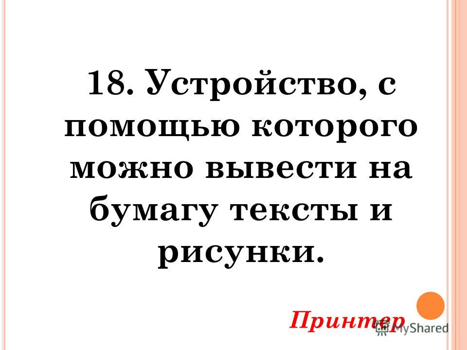 Принтер 18. Устройство, с помощью которого можно вывести на бумагу тексты и рисунки.