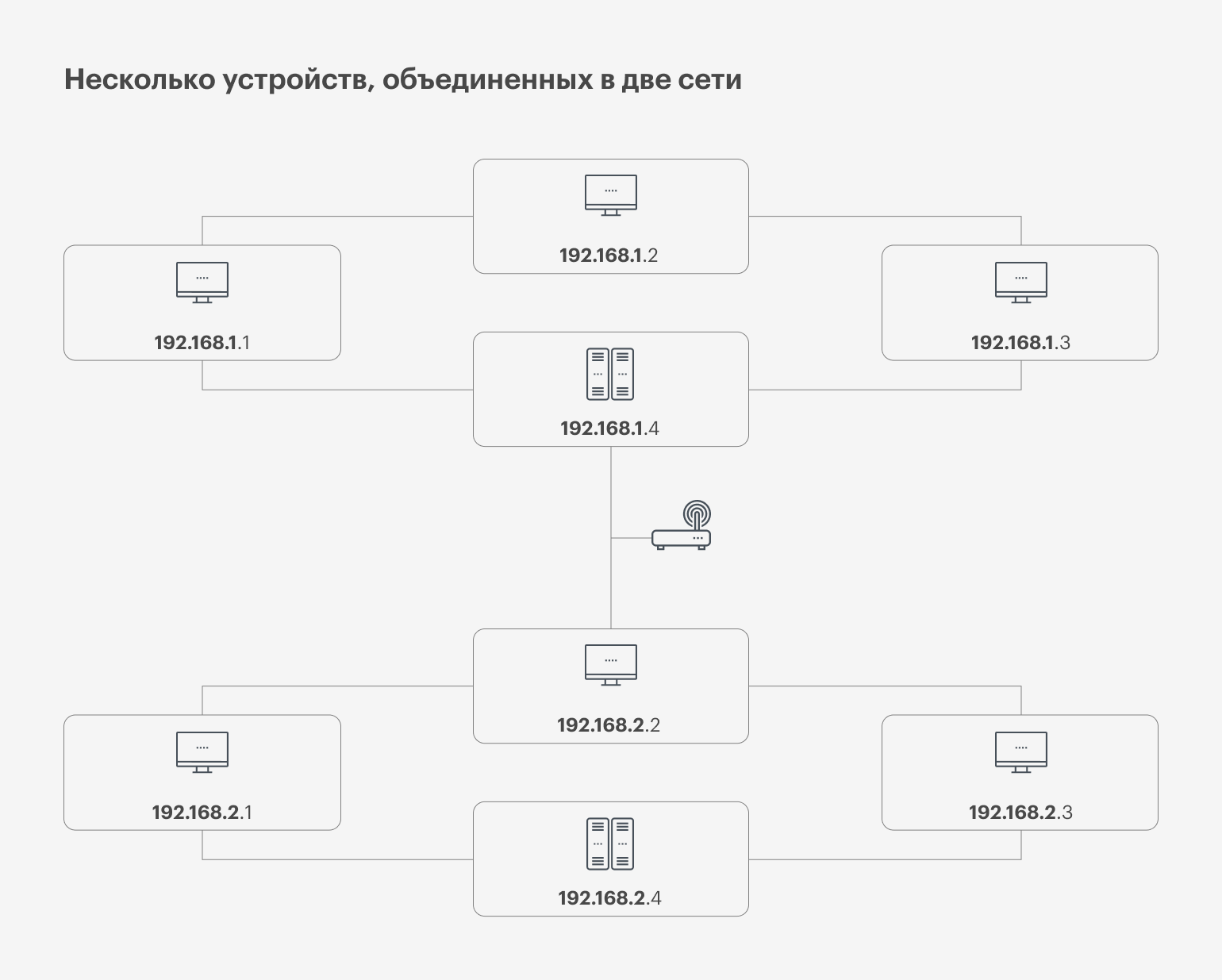 Устройство, идентификатор которого начинается, например, с 192.168.2, будет принадлежать к другой сети и не сможет связываться с устройствами из сети 192.168.1. Чтобы это сделать, понадобится роутер, который соединит две сети между собой.