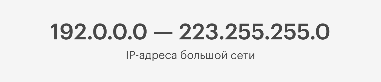 Всего таких сетей существует более двух миллионов, а подключаемых устройств в каждой — 256. Диапазон значений — от 192.0.0.0 и до 223.255.255.0 (223 — потому что у нас зарезервировано три бита).