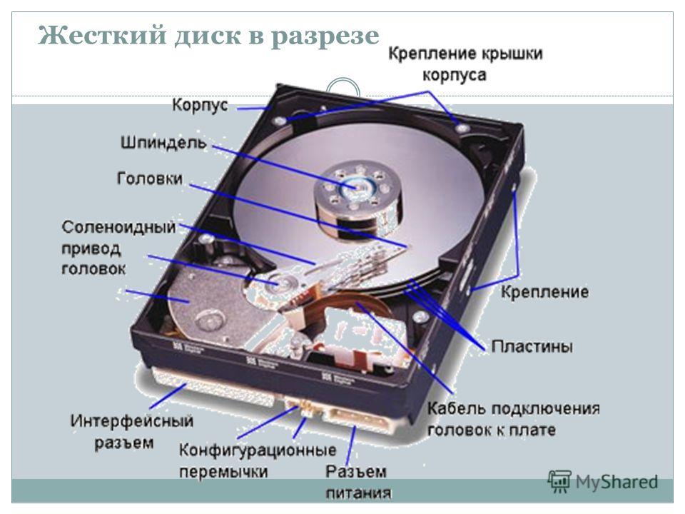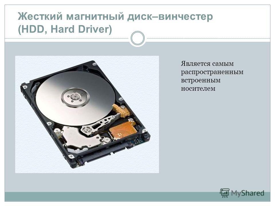 Жесткий диск (винчестер, винт, HDD, SSD) бывает внутренним в корпусе системного блока, или наружным, подключаемым через USB-порт. Объём может быть от ста мегабайт до нескольких терабайт.
