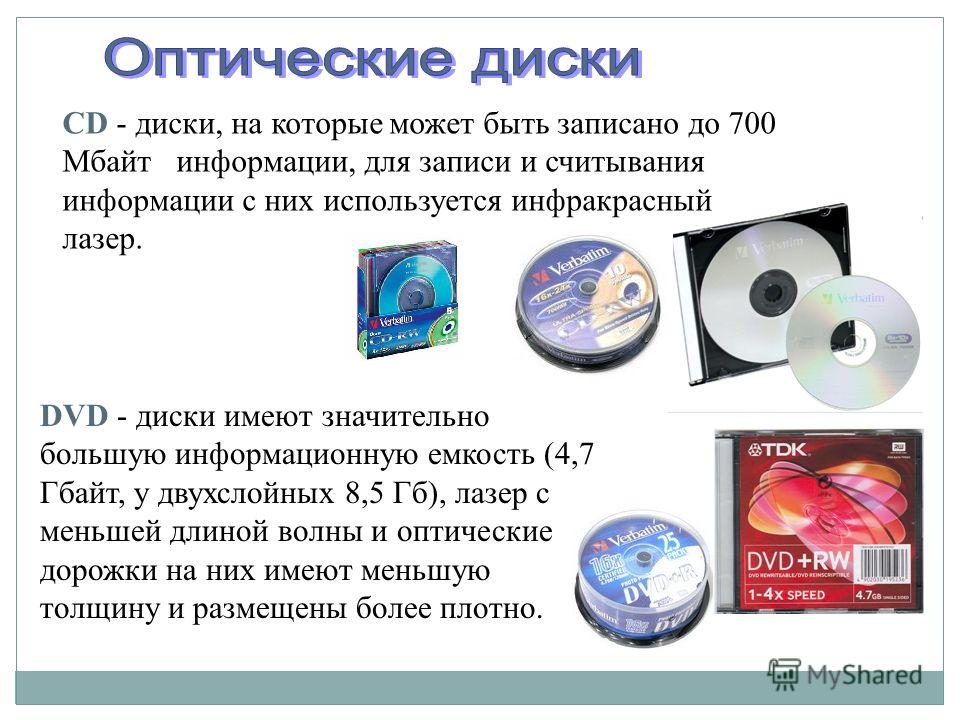 - Оптические накопители: CD- и DVD-диски, Blu-ray-диски — это устройства для чтения и записи данных с помощью лазерного излучения. Они могут быть использованы для хранения фильмов, музыки, программ и другой информации, но их емкость ограничена, поэтому они менее удобны для хранения больших объемов данных.