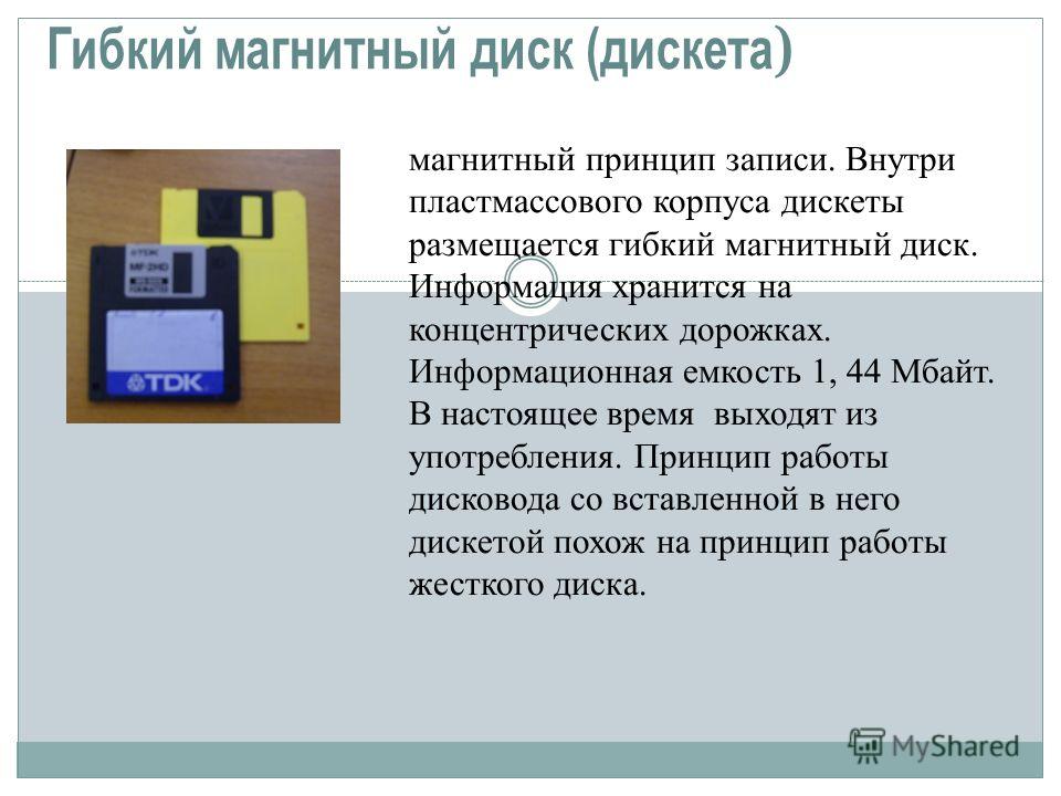 Дискета — плоская квадратная коробка, похожая на гибкий диск. Преимущество перед гибким диском: не так подвергается механическим повреждениям, так как носитель информации заключён в тонкой металлической корпус.