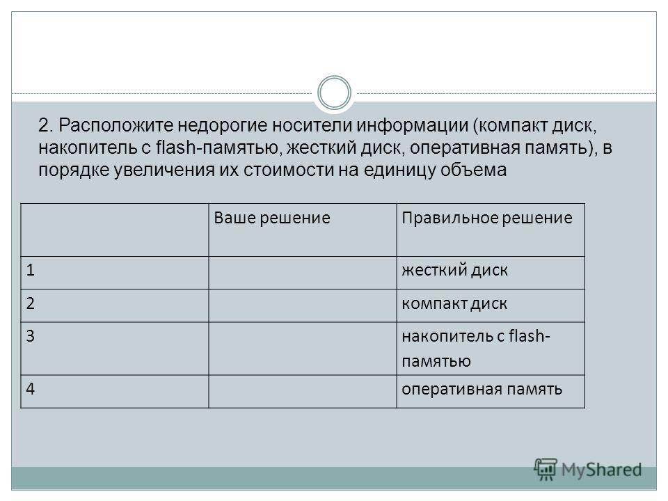 Ваше решениеПравильное решение 1жесткий диск 2компакт диск 3 накопитель с flash- памятью 4оперативная память 2. Расположите недорогие носители информации (компакт диск, накопитель с flash-памятью, жесткий диск, оперативная память), в порядке увеличения их стоимости на единицу объема