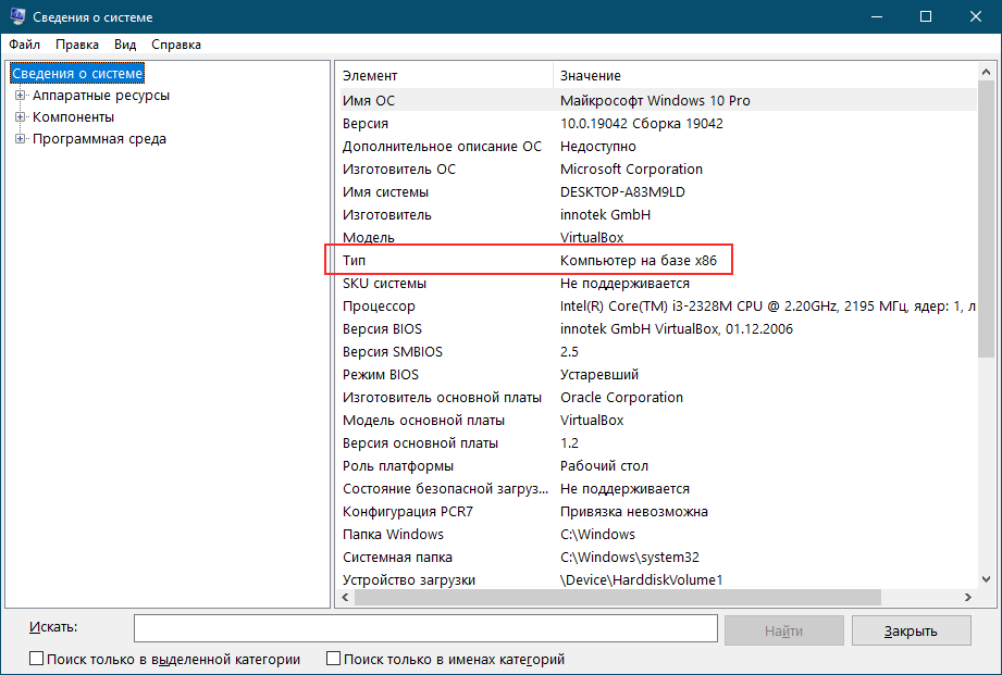 Если вы используете 32-разрядную Windows, вы не сможете запускать в ней программы и игры, разработанные исключительно для 64-разрядной системы, тогда как в последней можно будет запускать и 32-, и 64-битные приложения. Узнать разрядность ОС очень просто: выполните в диалоговом окошке Win + R команду msinfo32 и посмотрите значение в поле «Тип». Если в нём указано «Компьютер на базе x86», то ваша ОС 32-битная, для 64-рязрядных Windows значение будет «Компьютер на базе x64».