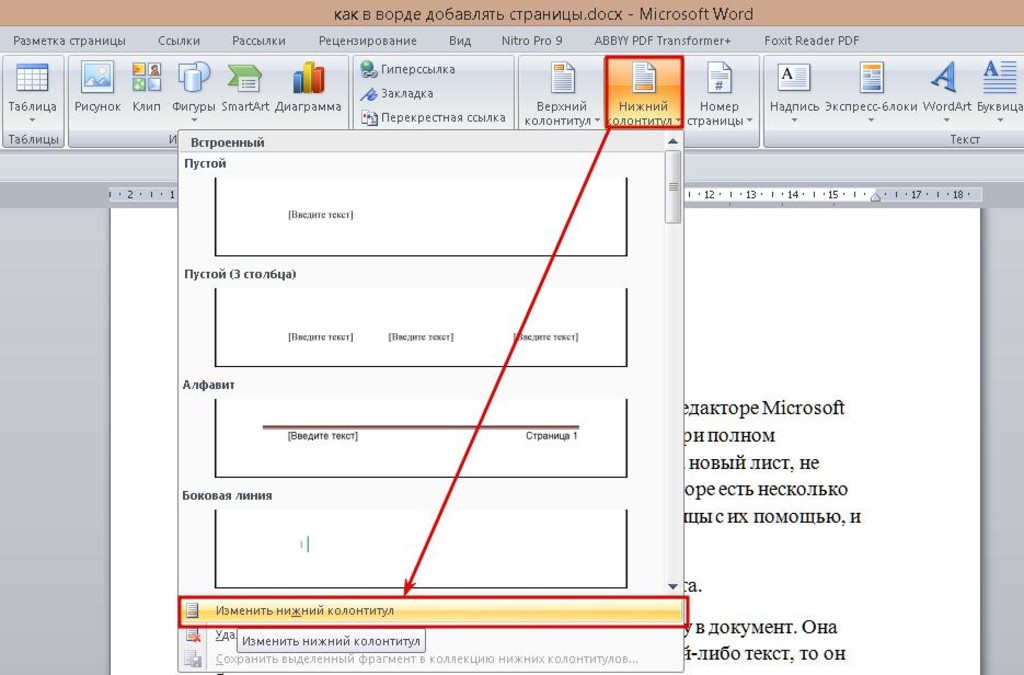 Дважды кликнуть левой кнопкой мыши на номере страницы или нажать одну из кнопок «Верхний / нижний колонтитул» и выбрать подпункт «Изменить колонтитул».