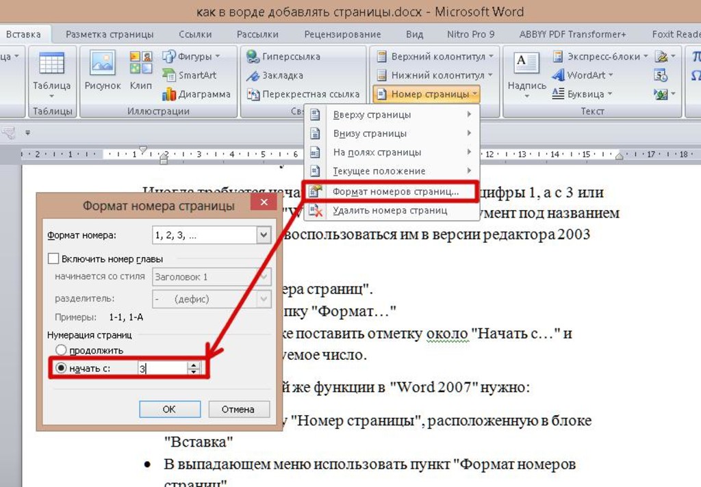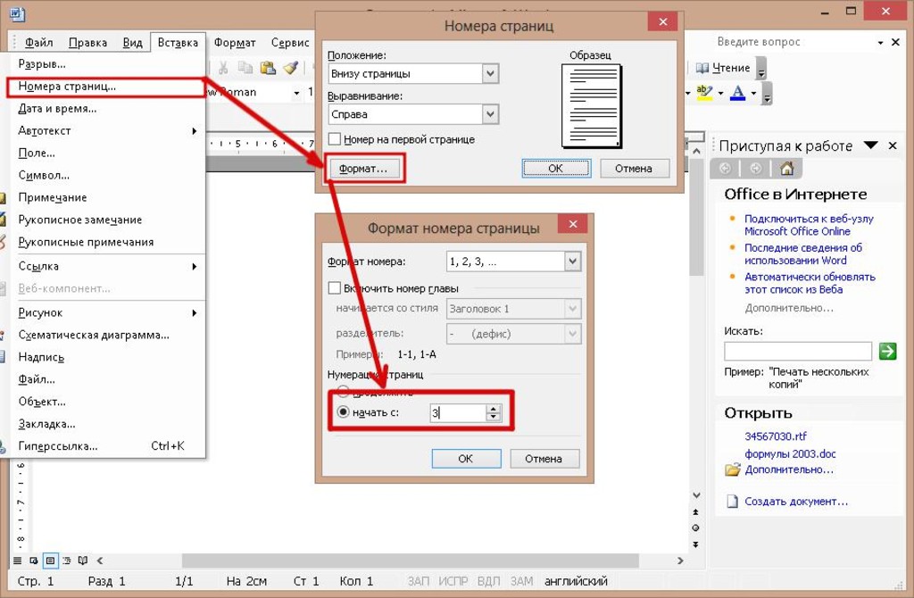 Иногда требуется начать нумерацию листов не с цифры 1, а с 3 или 50. Для этой в операции в «Word» присутствует настройка под названием «Формат страниц». Чтобы воспользоваться им в версии редактора 2003 года, нужно: