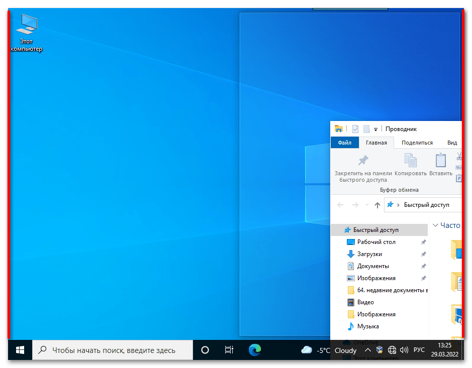 Быстро разделить экран на две части в Windows 10 можно посредством стандартного перетаскивания. Для этого достаточно навести курсор на заголовок активного окна, зажать левую кнопку мыши (ЛКМ) и перетащить его к правому или противоположному краю рабочего стола. Появится полупрозрачная рамка, обозначающая границы новой области отображения, которые по умолчанию всегда располагаются ровно посередине. Останется только отпустить кнопку мыши, чтобы завершить операцию.