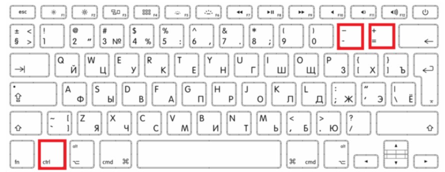 1. Открыть браузер;2. Найти на клавиатуре клавишу Ctrl (самый нижний ряд клавиатуры) и «-» или «+», для увеличения;