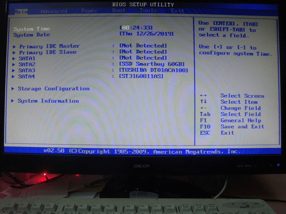 - Main — выбор даты, времени, жестких дисков и подключенных накопителей.