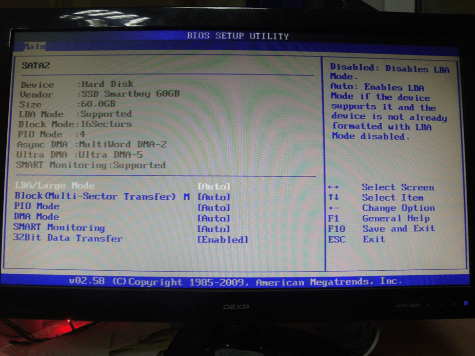 - LBA/Large Mode – изменение режима адресации накопителя, и если его объем меньше 504 МБ, применяется прямой, стандартный способ. Для твердотельных дисков объемом больше 504 МБ указывается логическая адресация (LBA), а Auto устанавливает ее как автоматическую.