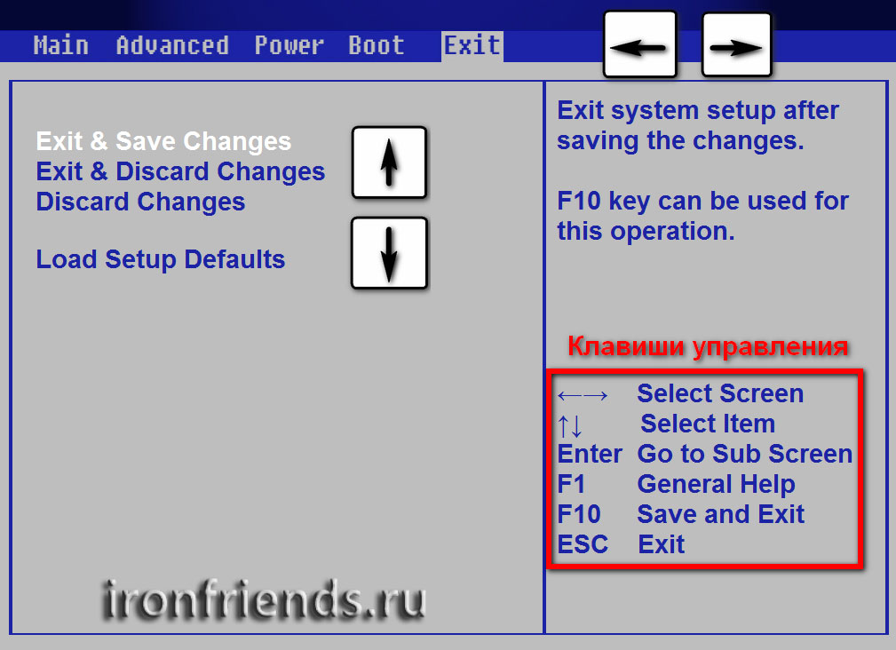 Если вы случайно что-то изменили или не уверены в правильности сделанных настроек, то прейдите на вкладку «Exit» и выберите «Exit and Discard Changes» («Выйти и Отменить Изменения») или нажимайте клавишу «Esc» до появления сообщения о выходе без изменения настроек и подтвердите действие («OK» или «Yes»).