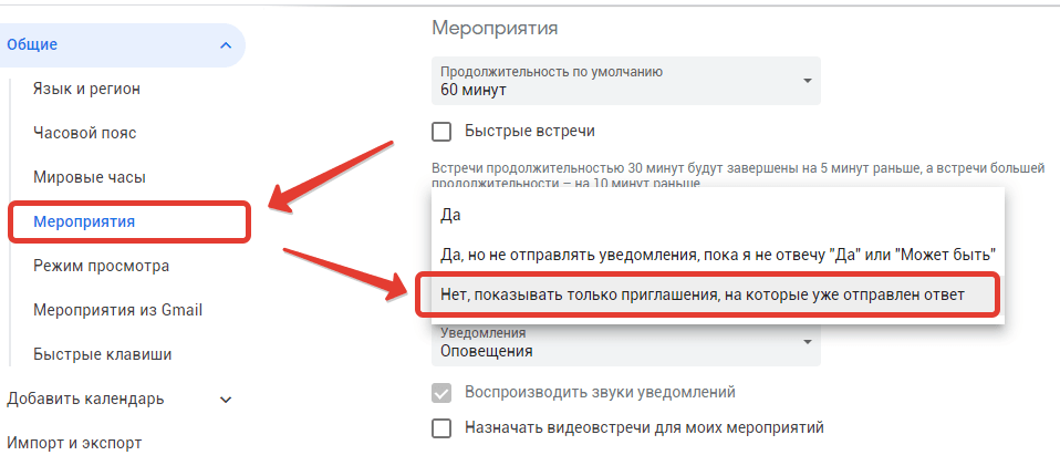 Теперь нам остается только выбрать параметр — Нет, показывать только приглашения, на которые уже отправлен ответ. Смотрите подробный скриншот ниже.
